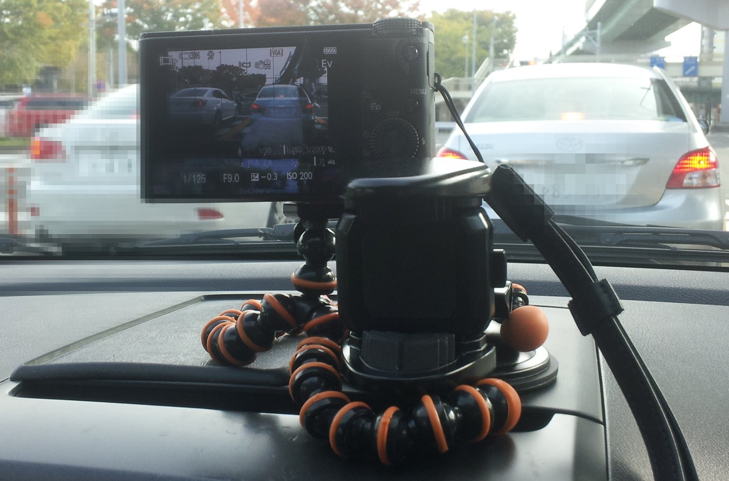 スマホの車載アダプターに安いなんちゃってゴリラポッドをくっつけて。